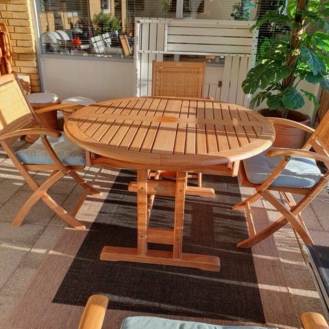Teak havemøbelsæt: rund 90Ø cm bord + 4 stole med hynde