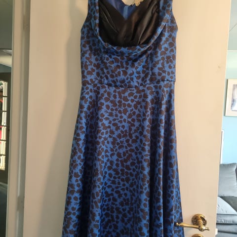 Mørkeblå kjole med fugleprint, rigtig flot, 1950'er stil, uden ærmer, fra mærket Lindy Bop, rød krave, røde knapper, lynlås i siden, læg, lommer, for, kraftig bomuld, god men brugt. Ingen røg, dyr eller skyllemiddel.