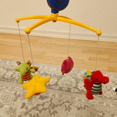 Næsten helt ny uro der kan dreje rundt og lyse med forskellige farver oppe i loftet, den kan spille forskellig slags musik, men kan selv skifte musik og vælge til og fra med musik og lys