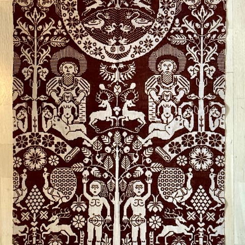 Unikt vægtæppe designet af Kåre Lindelof, udført i varme røde og hvide nuancer med smuk lys frynsekant. Tæppet prydes af dekorative og detaljerede riddermotiver, som giver et karakterfuldt og kunstnerisk udtryk – perfekt til dig, der værdsætter dansk tekstilkunst og retro design.