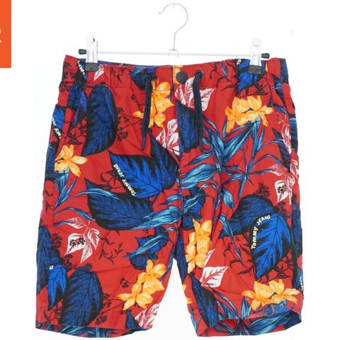 Et par blå badebukser med elastisk talje og rød snor. Der er en lille Tommy Hilfiger logo detalje foran nederst til højre og en lomme bagpå med en rød og hvid trekantet mønster.