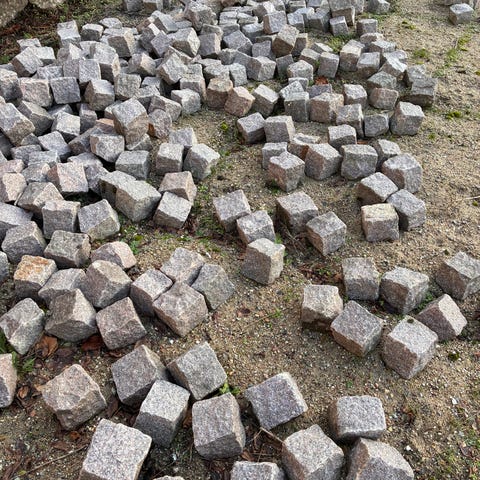 De genbrugte brosten – også kendt som københavner mix – er en smuk belægning af brosten taget op fra vores have.