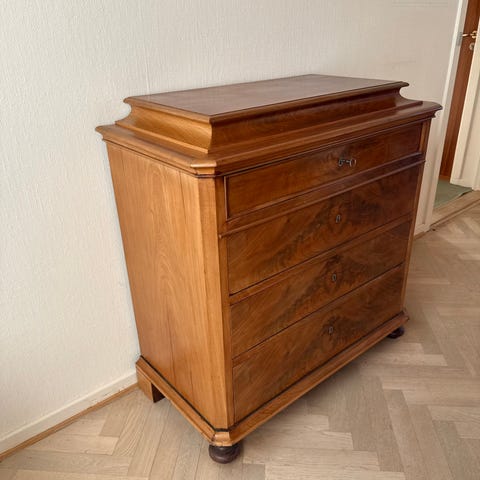 Antik høj kommode i sjælskåret mahogni – smukke rokoko/barok-detaljer og funktionel opbevaring