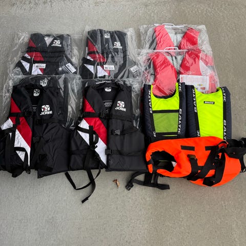 Redningsveste 6 stk i forskellige størrelser . 1 er ny , 1 er uden fløjte , 1 har et lille hul . ellers god stand brugt få gange ... for alle 500 kr