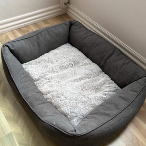 Pudemål: 53 cm x 43 cm og godt polstret/ blødt underlag til den lille/ ml. str. hund alt efter om den ligger udstrakt eller ruller sig sammen i sengen..