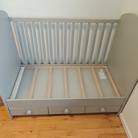 Enkel tremmeseng, hvid med egetræsben. Bunden kan højdejusteres i 3 højder, i takt med at barnet vokser. Materiale: fyrretræ, lamineret MDF samt egetræ (benene).