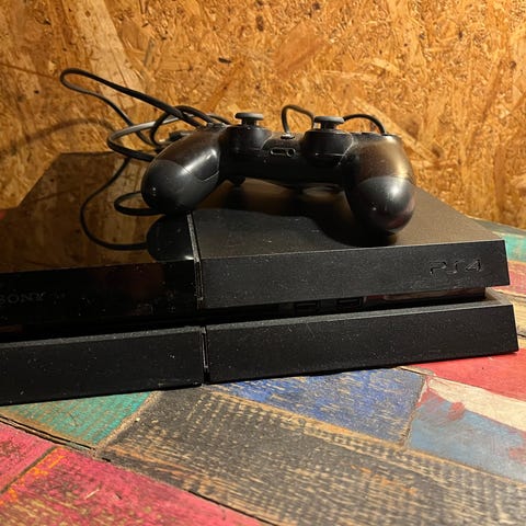 Sælger denne PlayStation 4 konsol, som er den originale "Fat" udgave. Konsollen har den klassiske todelte sorte finish med både mat og skinnende overflade.