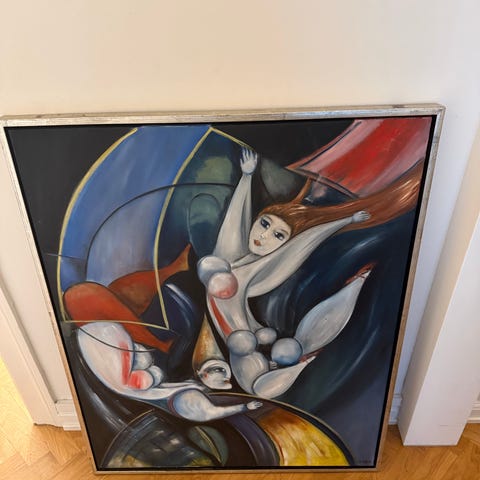 Et maleri med enkel, grafisk komposition. Sort og hvidt, indrammet.,Afhentes i:,Røde Kors Glostrup (161),Bemærk at mail, chat og beskeder ikke besvares, og varen skal købes på knappen "Gå til varen"