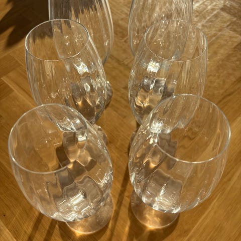 Glasset er glat og klart med en bred bund og en smalere top. Glasmateriale.,Afhentes i:,Røde Kors Glostrup (161),Bemærk at mail, chat og beskeder ikke besvares, og varen skal købes på knappen "Gå til varen"