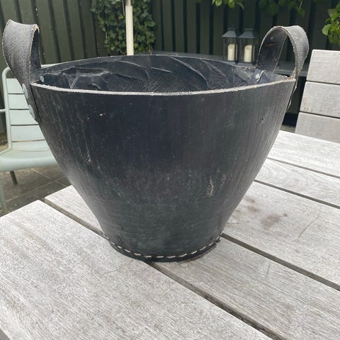 Halvhøj krukke med hank lavet af gummi. Ca 75 cm høj.