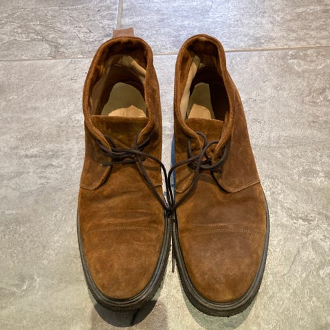 full grain i str 42. De er kun brugt en enkelt gang og fremstår derfor som helt nye. Normalpris er ca 3000 kr men de sælges til 1100 kr. Skoene er Goodyear - randsyede.