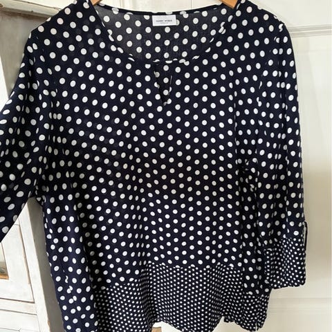 Fin blå bluse med effekter i form af hvide striber på ærmerne, hvid halskant og et lille bånd til at binde ærmerne forneden.