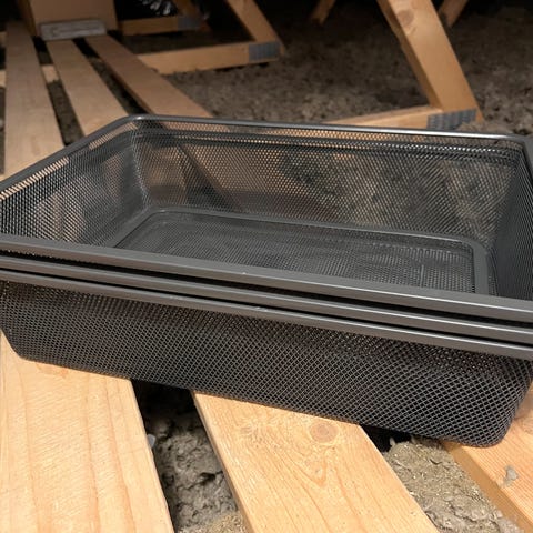 Kasse med håndtag. Krydsfiner (bøg) med brun laminat på ydersiden. Rå inderside. Jeg har sat filt på undersiden, så den ikke ridser, når man trækker den hen over gulvet. God stand.