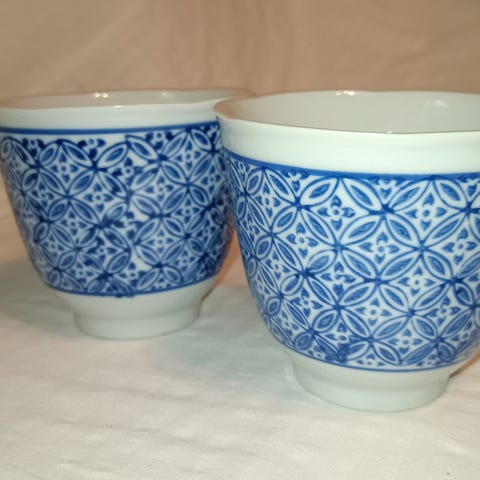 Rigtig pæn keramik tekop/krus med hvid hank, er blå med guld bobler udv. og hvid indv. H: 7,5 cm Ø 10,5 cm