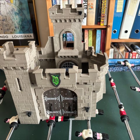 Hyggelig grøntsagsbod med vægt, kasseapparat, figurer.