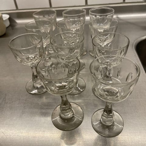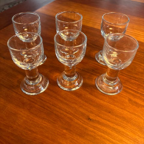 Holmegaard, Christianshavner, Snapseglas. Designet i 1973 af Michael Bang i samarbejde med Peter F Heering og Bent Woldstrup efter model af de gamle jernbaneglas og til Heerings Christianshavnersnaps. Højde 8,6 cm. Øverste diameter 4,5 cm. De er signeret med HG4.