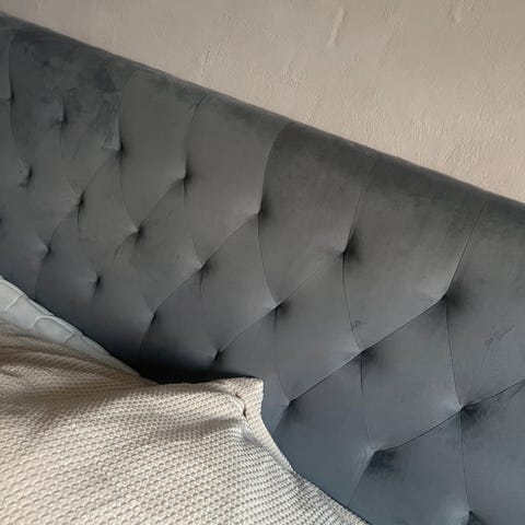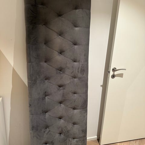 Meget fin ellos sengegavl, med betræk i hør, der kan tages af og vaskes. Der er ben, så den kan stå på gulvet og kraftige øjer, så den kan hænge på væggen. Der er ingen pletter eller misfarvninger på stoffet.
