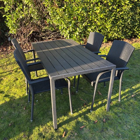 Sort havebord med målene 70x70 cm. Bordet er fremstillet i fletmateriale og har en stabil firkantet fod. Velegnet til udendørs brug i haven eller på terrassen.