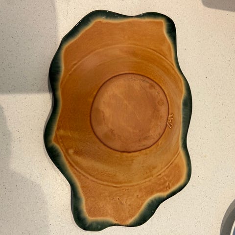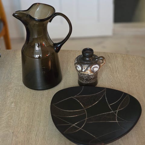 Smukt og stort retro keramik fad fra West Germany, modelnummer 1002-1. Fadet fungerer perfekt som frugtfad, serveringsfad eller blot som dekorativt indslag i indretningen. Overfladen har en varm rustfarvet mat glasur med blanke dekorationer i grøn, brun og beige, som giver et unikt og tidstypisk udtryk. Undersiden er glaseret i blank finish.