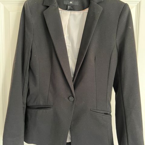 Klassisk sort blazer med lyst satin-agtigt for. Den er uden knapper, men med to lommer foran, som stadig er syet sammen. Den er brugt et par gange, men er som ny.