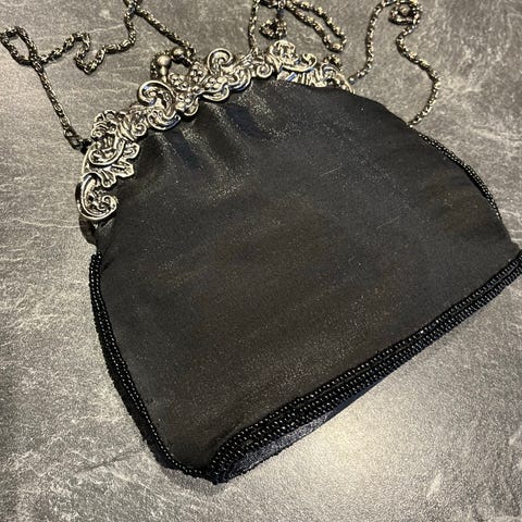 En flot skuldertaske med en tynd rem (L-65 cm), som kan skjules inde i tasken, så tasken bruges som f.eks.clutch. Meget elegant. Sort lakeret kunstlæder med ruskindsindlæg og magnet knaplukning. Tasken er stiv i formen.
