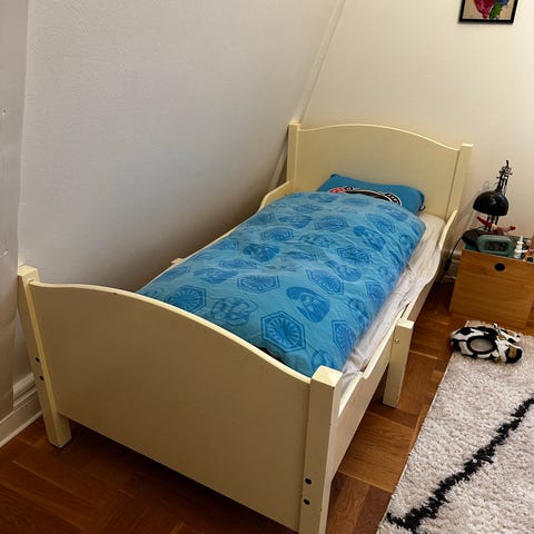 Smuk børne udtræksseng i jern. Creme farvet med smuk patina. Sengen er nu 56 cm i bredde. Vi har nemt brugt en madras fra IKEA 60 cm x120 cm. Længden er 120 cm men kan trækkes ud til 160 cm.
