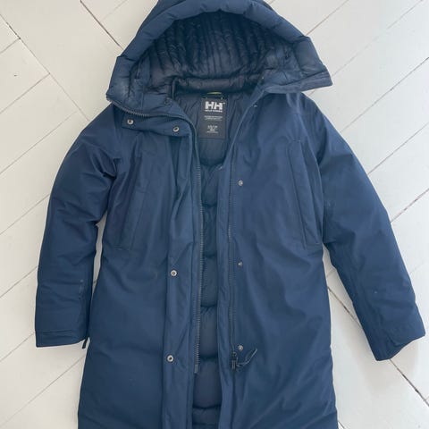Helly Hansen dunjakke. Jakken er sort med hætte. Vindtæt og vandafvisende. Størrelsen svarer til en teenager på 15-16 år eller en petit voksen. Den er meget varm med isolering og reflekterende detaljer på ærmerne for øget synlighed. Nypris 3600,-. Sælges billigt for 650,-. Har samme jakke i blå med mindre flænge ved ærme -sælges for 500,-.