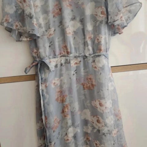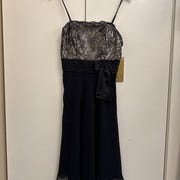 Hvid med sort, Polyester, Næsten som ny, Hvid kjole med sort midterstykke med en stor sløjfe og sorte prikker på underdelen. Min datter bad om at få syet et bredt, hvidt bånd på, som går omkring nakken, men det kan sagtens tages af igen og bruges uden - eller med en lille bolero.