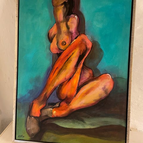 Et maleri uden ramme i str. 100 x 100 cm, der er lavet med dripping teknik - og hvor malingen er autolak :)
