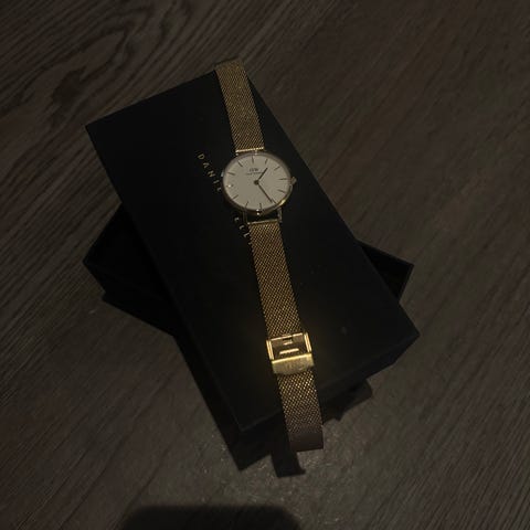 Daniel Wellington Kvinde ur med rund urskive og guldnetrem i rose guld. Uret leveres i en æske sammen med et matchende armbånd. Designet er minimalistisk med en lys urskive og guldfarvede detaljer. Der kommer en metal stick til at justere størrelsen på det. Og batteriet skal muligvis skiftes. Har haft det en del år med gået med det maks. 5 gange.