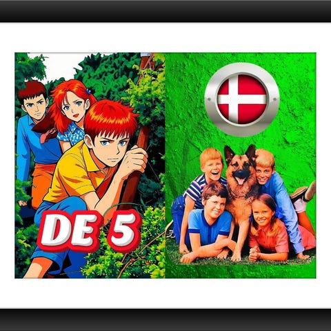 Klassisk dansk familiefilm baseret på Enid Blytons populære bogserie om De 5. Georg(ina), Julian, Dick, Anne og hunden Tim tager på lejrtur, men ferien udvikler sig dramatisk, da Dick bliver kidnappet ved en fejl. Snart er børnene på jagt efter kidnapperne og deres ven.