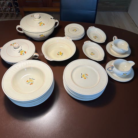 4 fade, 2 store skåle, 1 lille skål, 2 sovseskåle, den ene har et lille hak