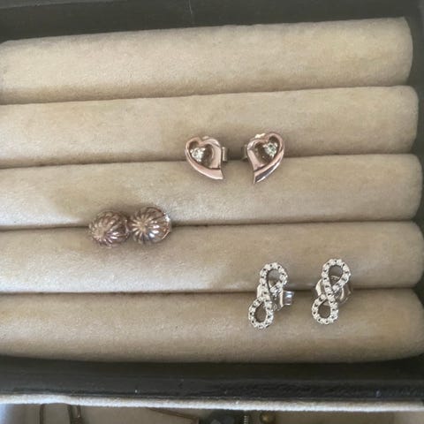 Et par små sølv øreringe, hver med en charm i form af en lille blomst eller tilsvarende form. Øreringene er ca. 2 cm i størrelse og har låse, der sikrer dem på plads i øret. De er enkle og elegante, velegnede til daglig brug eller som et subtilt tilbehør til mere formelle anledninger.