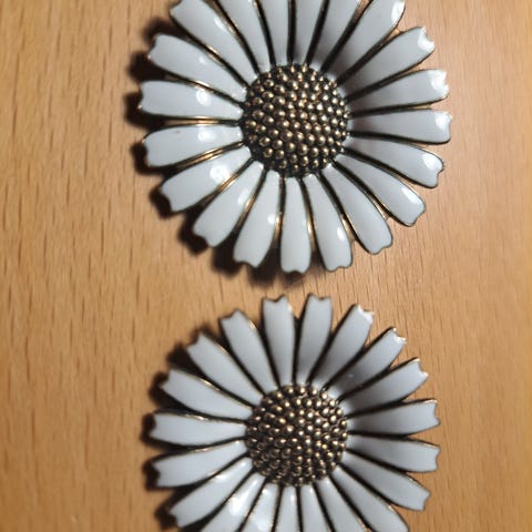 En vintage marguerit formet broche lavet i metal med en forgyldt finish. Brochen har hvid emalje på kronbladene og en rusten midterknap. På bagsiden kan man se en nål til fastgørelse. Størrelsen på brochen er 3 cm i diameter.