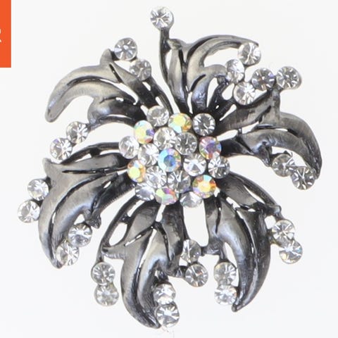 Brochen er formet som et blad og er dekoreret med mange små blå sten. Den har en længde på 7,5 cm og er konstrueret med en sikkerhedsnål på bagsiden til fastgørelse. Den metalliske ramme holder stenene solidt på plads og giver brochen et elegant udseende.