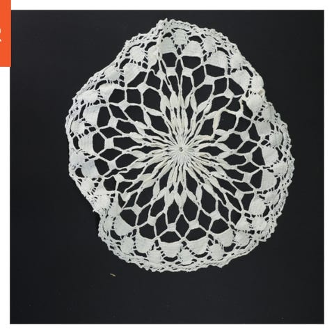 Denne vare er en lille, håndlavet, rund hæklet dug eller serviet. Den har en delikat design med blomster- og cirkelmønstre. Det primære materiale synes at være en hvid tråd, og størrelsen er Ø 8 cm. Perfekt til at pynte små borde eller anvendes som dekoration i hjemmet. Tags: hæklet, dug, dekorativ, håndlavet.