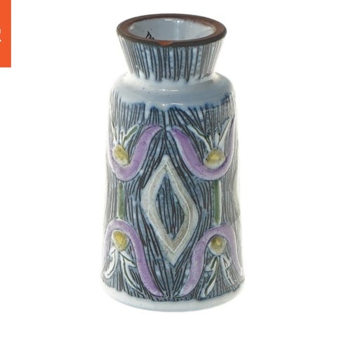 Denne vase er lavet af porcelæn og har en elegant blomsterdekoration med rosa blomster og grønne blade. Designet er traditionelt og ideelt til dekorative formål. Vasen har en cylindrisk form og er 17 cm høj med en diameter på 7 cm. Den kan være en flot tilføjelse til ethvert rum i hjemmet. Der er initialerne 'K.W.' på bunden, som kan indikere producenten eller kunstneren.