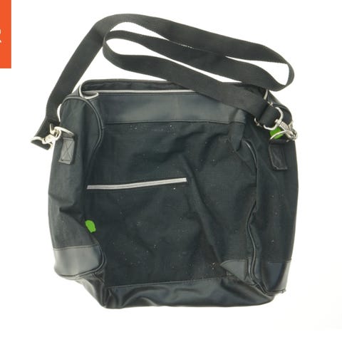 Tasken er lavet af sort stof med glatte sorte håndtag, der er fastgjort med metalnitter. Den har en simpel rektangulær form og en rummelig indre kapacitet. Det bløde materiale ser ud til at have lidt brugsspor, som kan ses på overfladen i form af små pletter eller stofmærker.