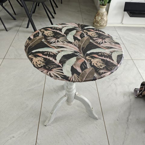 Pænt rundt lille bord med dekorationer på af en blomst. I diameter er det ca 54 cm og høj ca 57 cm.