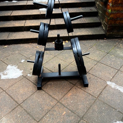 Stativet har flere stænger til at holde vægtskiver sikkert og organiseret. Velegnet til brug i fitnesscentre eller hjemme til træningsudstyr.