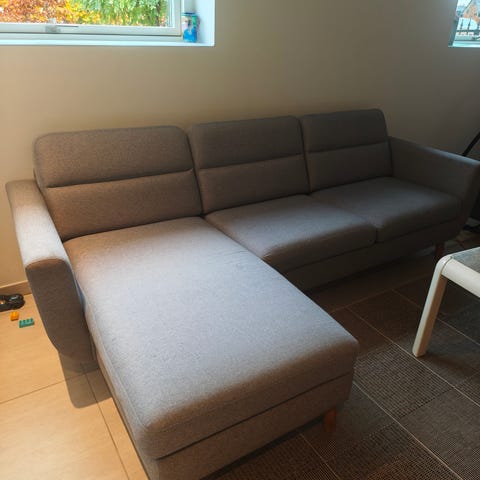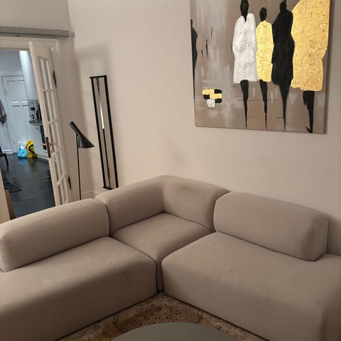 Modulerne har pletter og skjolder i betrækket som ikke har været forsøgt renset. Nye betræk kan også købes hos Nova Møbler.