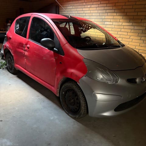 En Renault fra omkring halvfemserne men er blevet brugt som markracer indtil den gik i stykker. Begge drivaksler er i stykker så den kører ikke men motoren starter og kører helt fint. Der er meget rust og nogle af vinduerne kan ikke rulles op. Den er for ny nylig blevet støvsuget. Jeg har også registrerings attesten som man kan se på billederne.