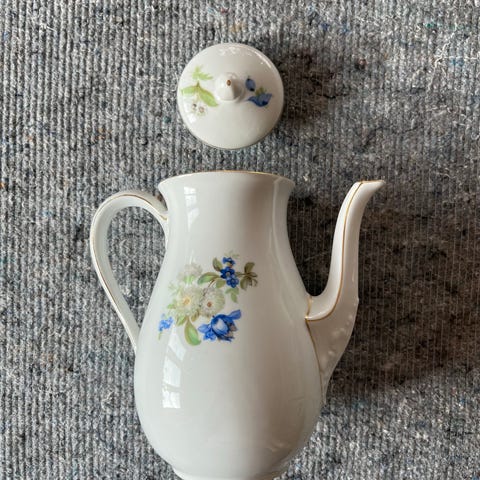 Håndmalede blomster og guldkant – alt i pæn stand med enkelte skår