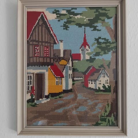 Fint lille ældre broderi i træramme med motiv af “Rejsen til Amerika”. Pænt. Træ rammen har brugsspor- se fotos. Stadig pæne farver.