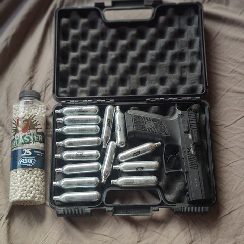 En airsoft pistol med lidt ekstra udstyr. Et godt starter kit da der både er hylster, gas, olie med oveni. Lyddæmperen der følger med er ikke en tracer.