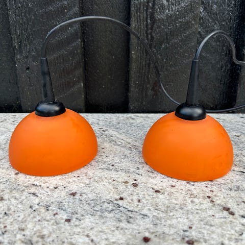 Vintage glas/jernlampe fra 70’erne med orange glas, enkel og flot, ca 18 cm høj