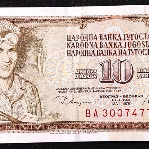 Jugoslavija 100 Dinara sedel fra 1946. Sedlen er rød med motiv av en ung kvinne på forsiden og et bylandskap på baksiden.
