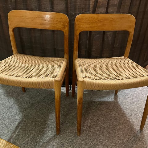 4. Stk. Niels O. Møller stole model 75 af massiv teak, sæder betrukket med lyst uldstof fra Hallingdal. Designet af N.O. Møller produceret af J.L. Møllers møbelfabrik. Fremstår i meget fin stand.