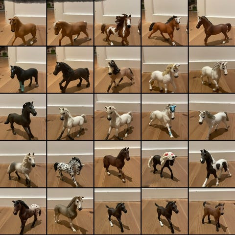 Set fyldt med heste fra schleich og andre mærker tilhørende, hvis du ønsker specielle typer af hestene så skriv endelig til mig 😊