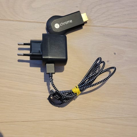 Google Chromecast with Google TV streaming media player i hvid farve. Enheden understøtter Dolby Vision og Android TV, og leveres med fjernbetjening og strømforsyning. Designet til at streame digitalt indhold til tv via internetforbindelse.
